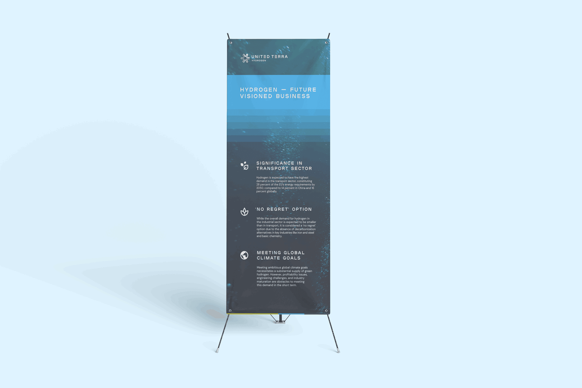 United Terra, a dynamic energy company focused on expanding their renewable energy options, faced a branding challenge. With four distinct sub-brands; Oil + Gas, Hydrogen, Solar + Wind, and Trading, they needed a system to differentiate each sub-brand while maintaining overall brand cohesion. Although they had a strong colour palette and a recognisable icon, a more refined approach was required to effectively communicate their diverse offerings and attract investment.